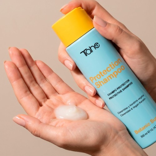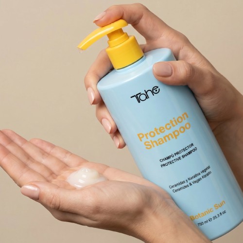 El Champú Protection Shampoo incorpora un sistema de quelación molecular que captura y elimina iones metálicos acumulados en la fibra capilar, especialmente tras la exposición a piscina, mar o polución. Esta acción detox se realiza sin alterar los aceites naturales del cabello, manteniendo su hidratación y evitando la sequedad.