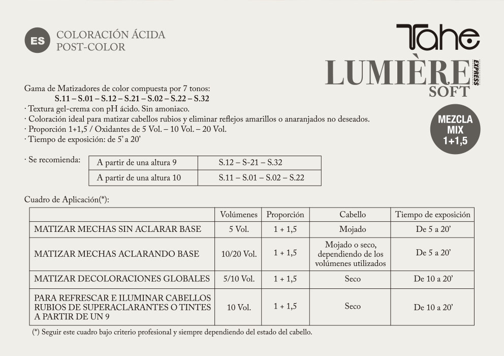 (*) El tiempo de exposición y la elección de los volúmenes utilizados dependerán de la sensibilidad del cabello y del efecto deseado pero siempre bajo criterio profesional.