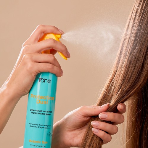 Este spray capilar incorpora polímeros termorresistentes que forman un escudo protector “sacrificable”. Esto significa que, ante la exposición a altas temperaturas (hasta 230ºC) o al sol directo, es el propio spray el que absorbe el impacto térmico, evitando daños estructurales en la fibra capilar.