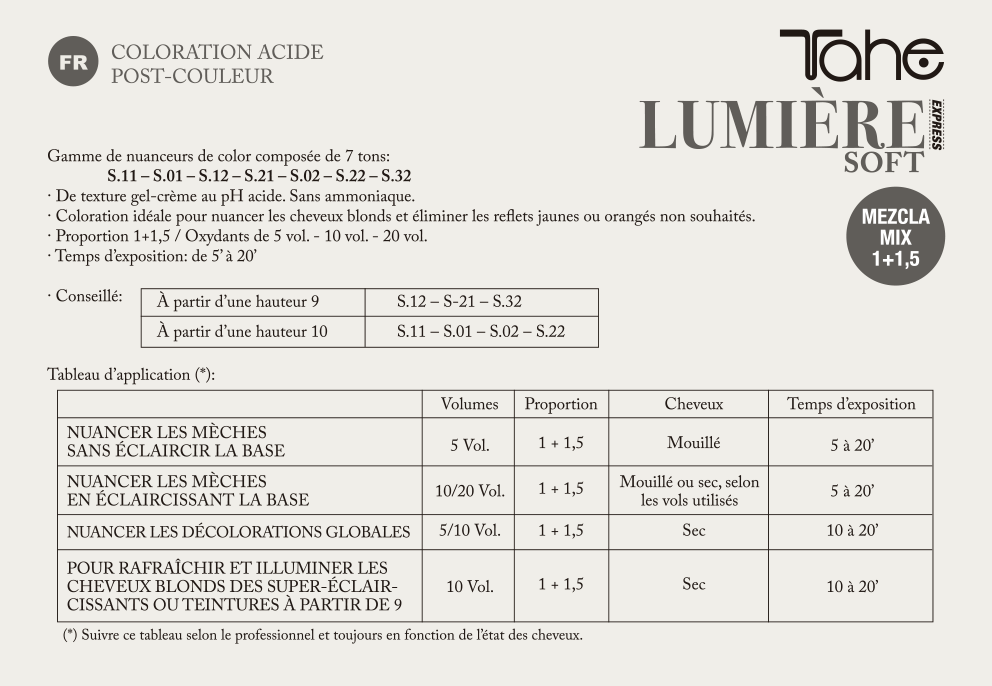 (*) Le temps d’exposition et le choix des volumes utilisés dépendra de la sensibilité du cheveu et de l’effet souhaité, mais toujours selon l´avis du professionnel.