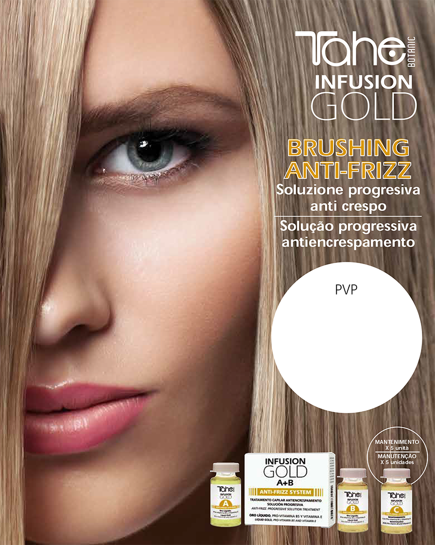 MANUTENÇÃO EM CASA: Paraotimizar o resultado, aplicar as ampolas INFUSION GOLD C MANUTENÇÃO ANTI-FRIZZ SYSTEM após cada lavagem entre os tratamentos de INFUSION GOLD A+B.