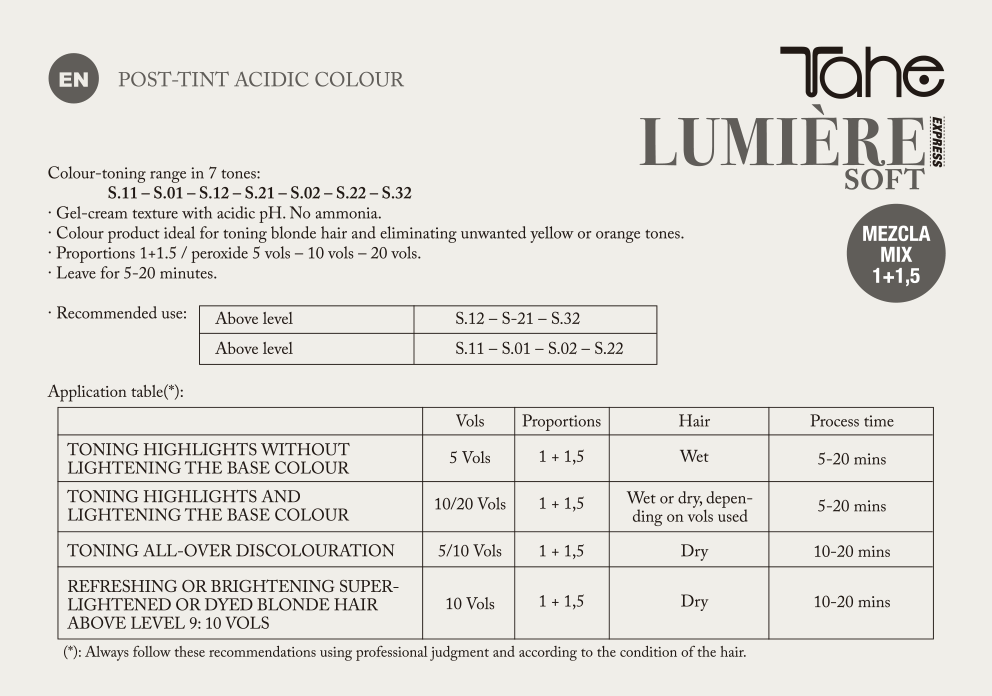 (*) Time and vols used will depend on the condition of the hair and the desired effect. Always use professional judgment.