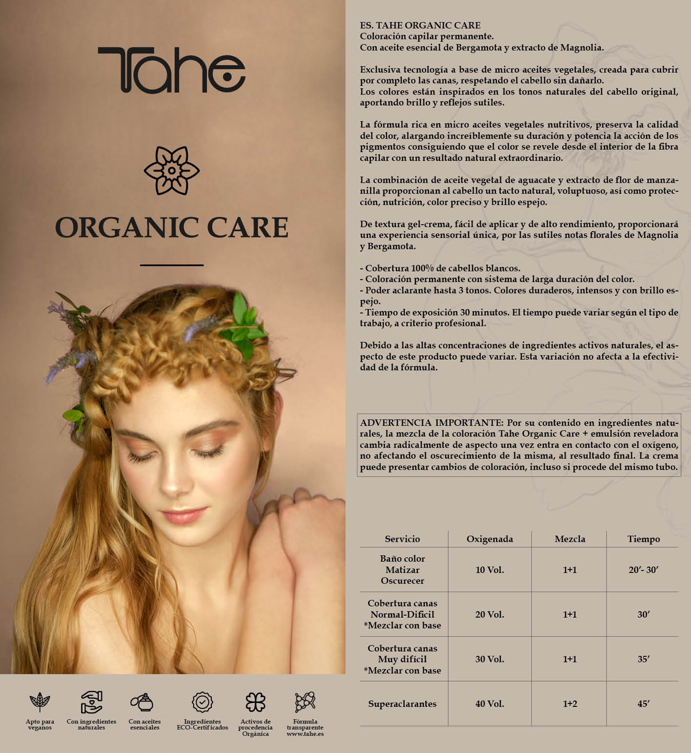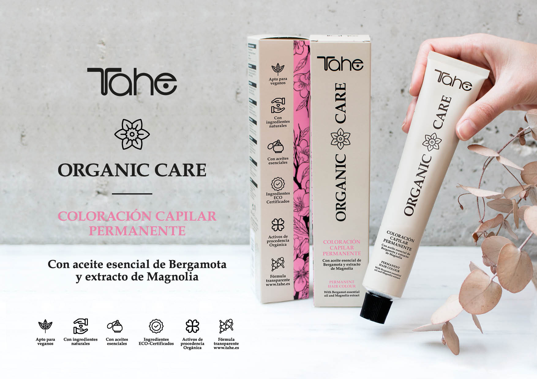 Organic Care es la línea orgánica de Tahe diseñada con exclusiva tecnología a base de micro aceites vegetales. La coloración de Organic Care está creada para cubrir por completo las canas, respetando el cabello sin dañarlo. Los colores de los tintes orgánicos están inspirados en los tonos naturales del cabello original, aportando brillo y reflejos sutiles.